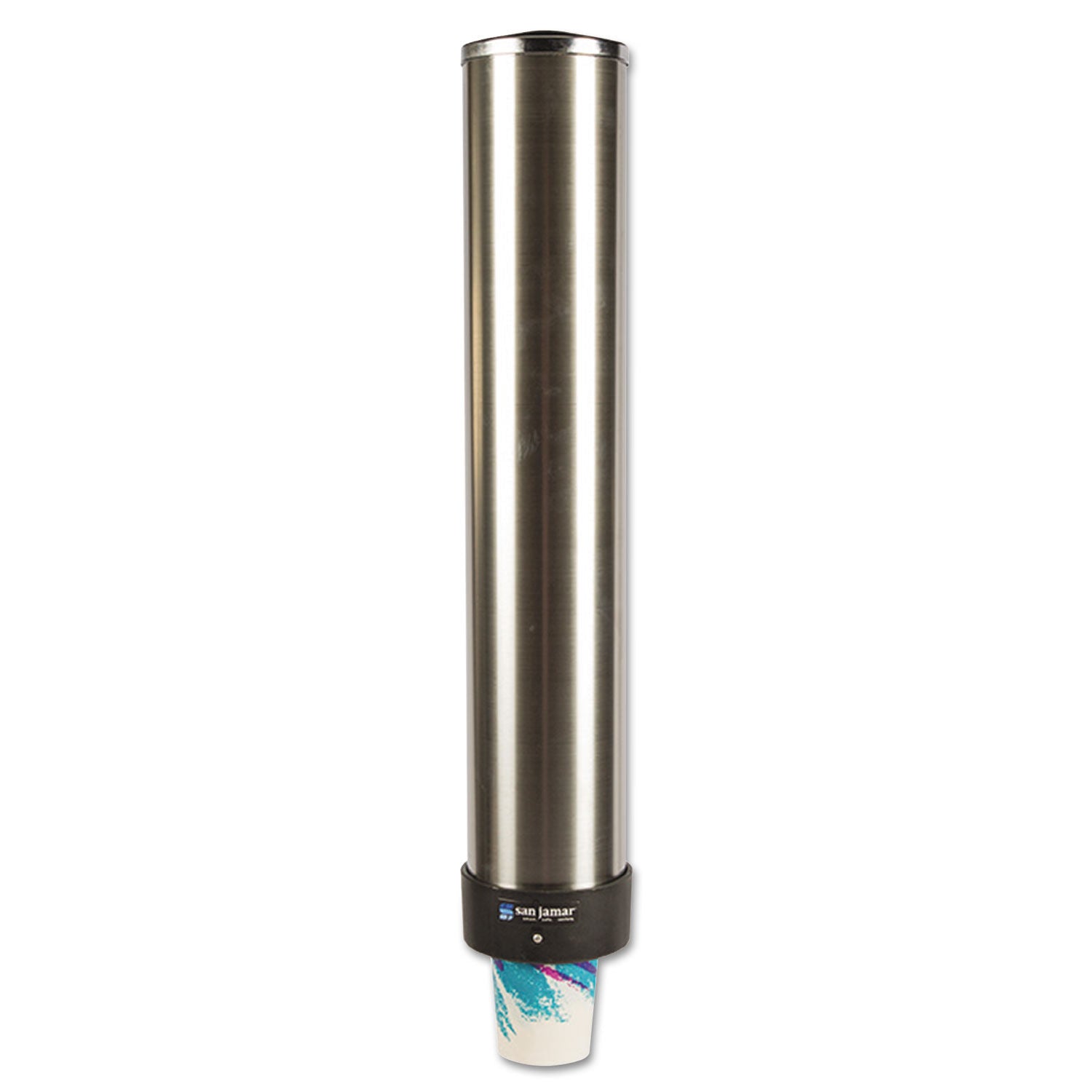 Convenient wall mount style with removable cap. Top load compartment. Use with cone or flat bottom, plastic or foam. Material(s): Stainless Steel; Cup Capacity [Max]: 24 oz.