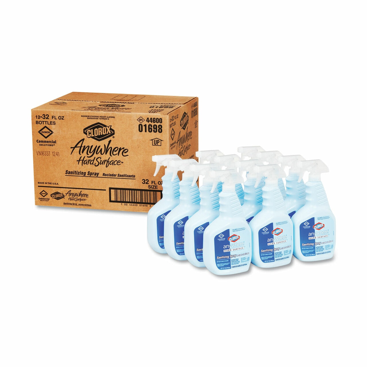 This Hard Surface Sanitizing Spray from Clorox Commercial Solutions kills 99.9% of bacteria on hard, nonporous surfaces, yet is color-safe and can be used without gloves. Apply to toys, phones, keyboards, light switches, high chairs, bathroom fixtures and food surfaces such as countertops. No rinsing required. Clorox Anywhere Hard Surface Sanitizing Spray is a revolutionary food-surface sanitizer. It’s suitable for food-contact surfaces, such as plastic cutting boards, serving trays, kitchen tools, high-chairs and plastic containers. Stock up on Clorox Anywhere Hard Surface Sanitizing Spray to use in commercial kitchens, office break rooms, day care centers, restaurants and other commercial facilities. Each carton comes with 12 - 32-oz. bottles so you can always have some on hand.