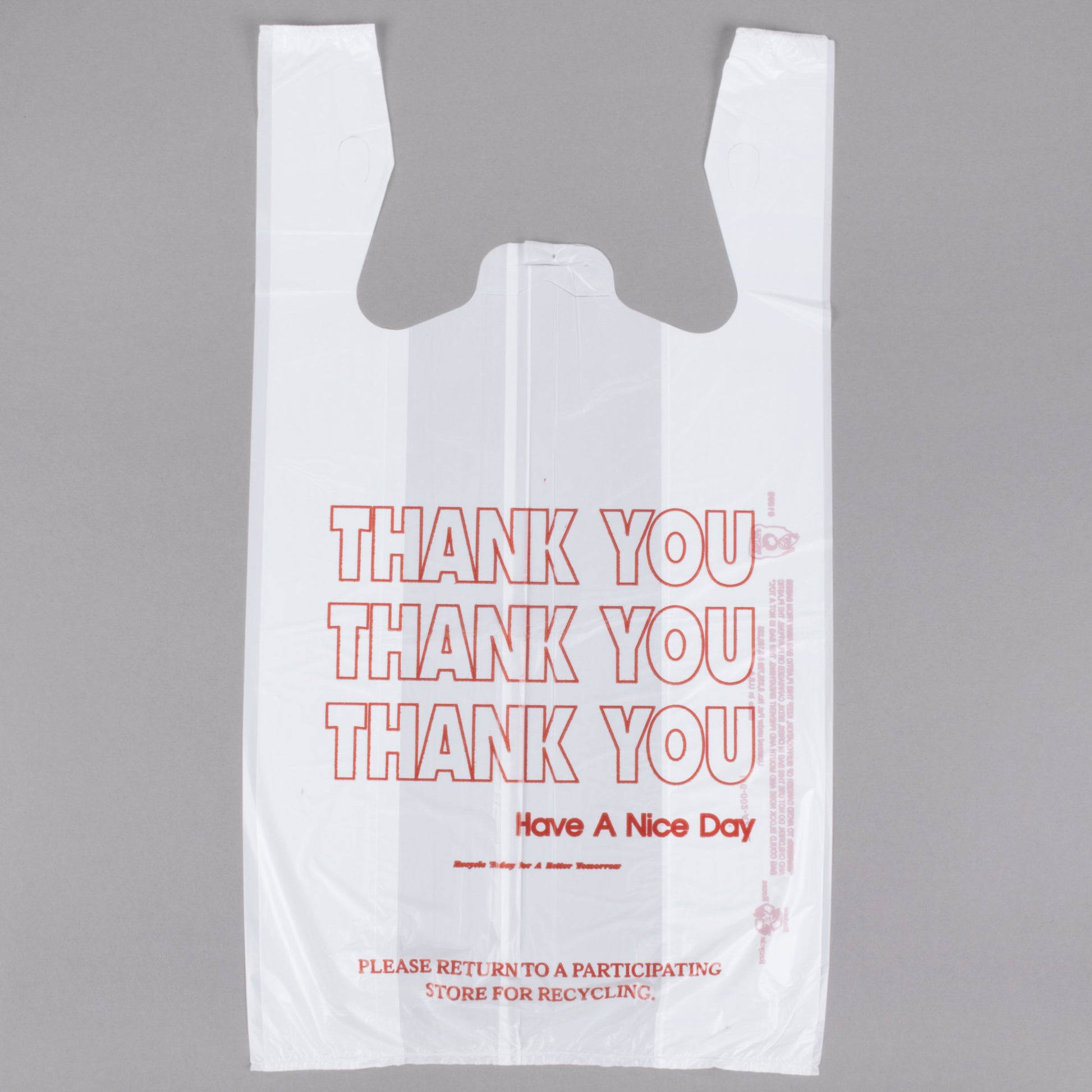 Featuring a high-density polyethylene construction, this bag is built strong to resist rips and tears, making it well-suited for carrying everything from produce to canned goods. Best of all, it's easily recyclable for quick clean up! Additionally, this bag features "Thank You" and "Have a Nice Day" printed in red text across the front in order to show guests that you care. Plus, in comparison to traditional paper bags, this bag's lightweight, plastic design makes it easy to open and pack items for fast, efficient service that will keep your lines moving steadily.