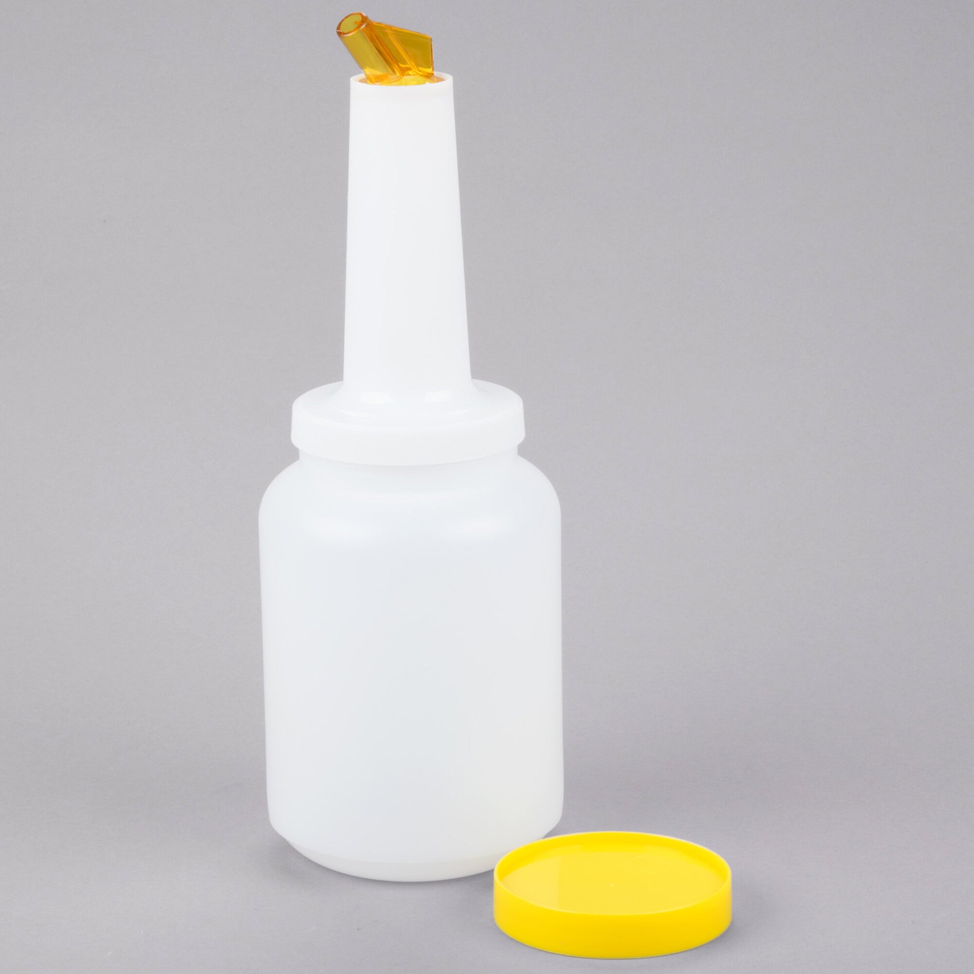 This 2 qt. white pour bottle with orange spout and cap will help you serve and store salad dressings, juices, and simple syrups with ease! The durable container is made of high density polyethylene and boasts straight walls with no sharp interior edges, ensuring it won't collect food particles or harbor bacteria. While the included neck provides your employees with a secure grip as they pour drinks for customers, the spout keeps contaminants out and promotes fast, controlled pouring. When it's time to store your product, simply screw the cap on in place of the neck and set it in the refrigerator. Thanks to the cap's stackable design, it's easy to store full backup containers for your busiest serving hours.