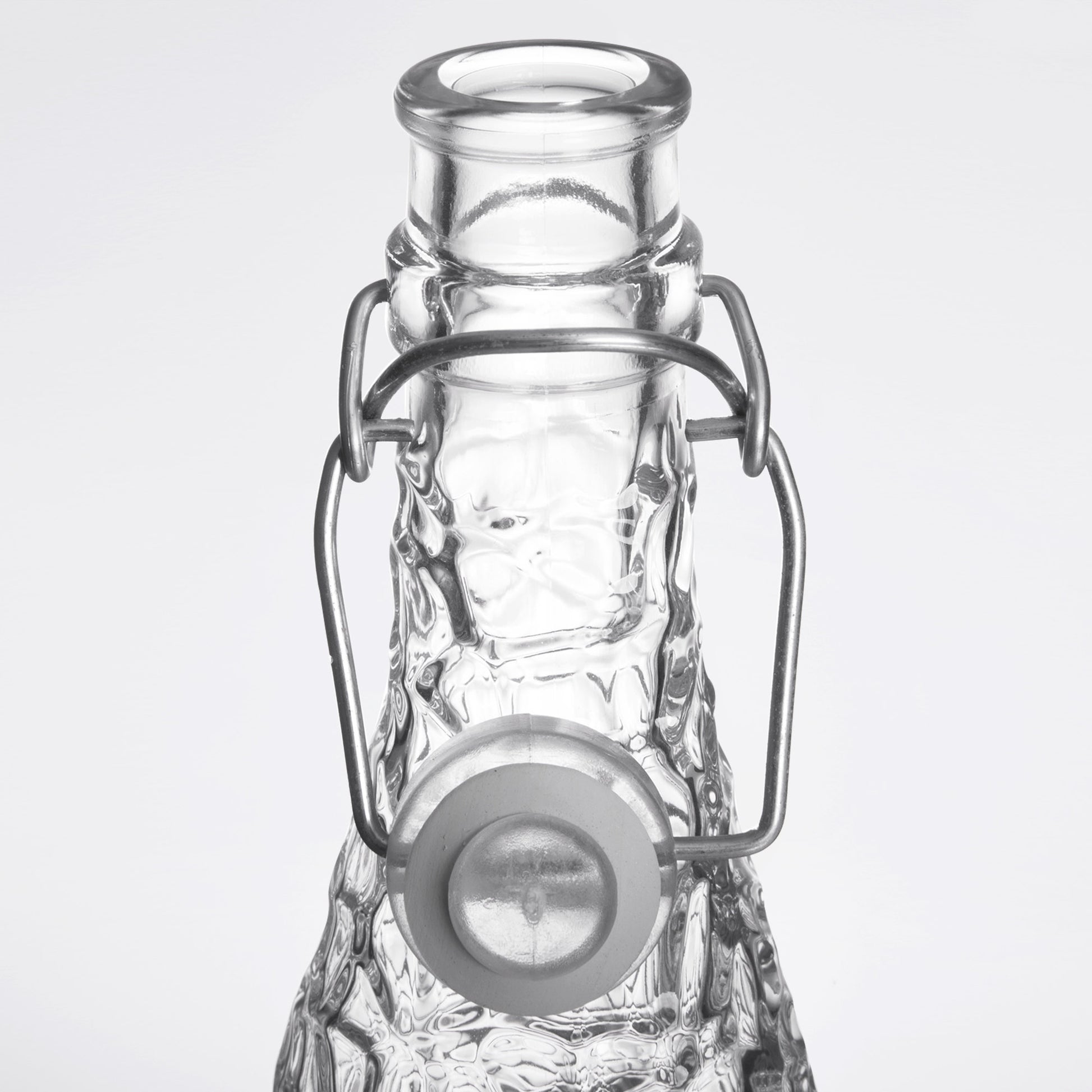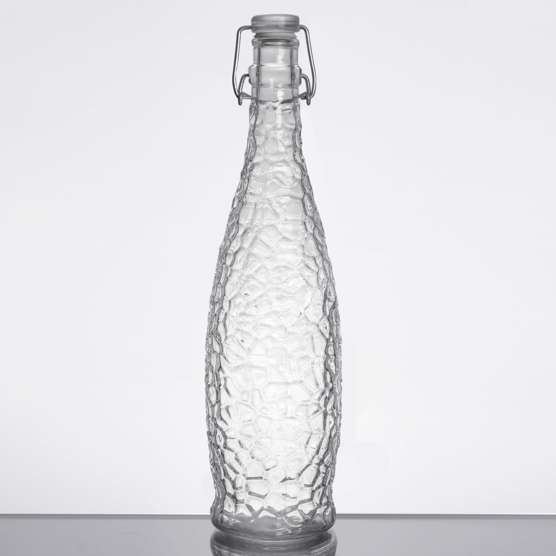 Complete your table setting with this Libbey 13150120 34 oz. glacier bottle with wire bail lid! Featuring an intricately textured glass surface and a clear wire bail lid, this tabletop piece adds classic charm to your establishment. Perfect for serving water tableside, guests will be delighted by the sophisticated and unique presentation. With a 34 oz. capacity, you can even leave this bottle on the table to allow your guests convenient access to refreshing water throughout their meal. The clear lid provides a tight seal to prevent spills, while also keeping your products fresh. Plus, the lid is attached by a wire bail, so there's no risk of misplacing it! An elegant way to display a variety of menu items, you can showcase gourmet dressings, oils, and vinegars to add an element of sophistication to your decor. With a perfect blend of style and function, upgrading your table setting has never been simpler.