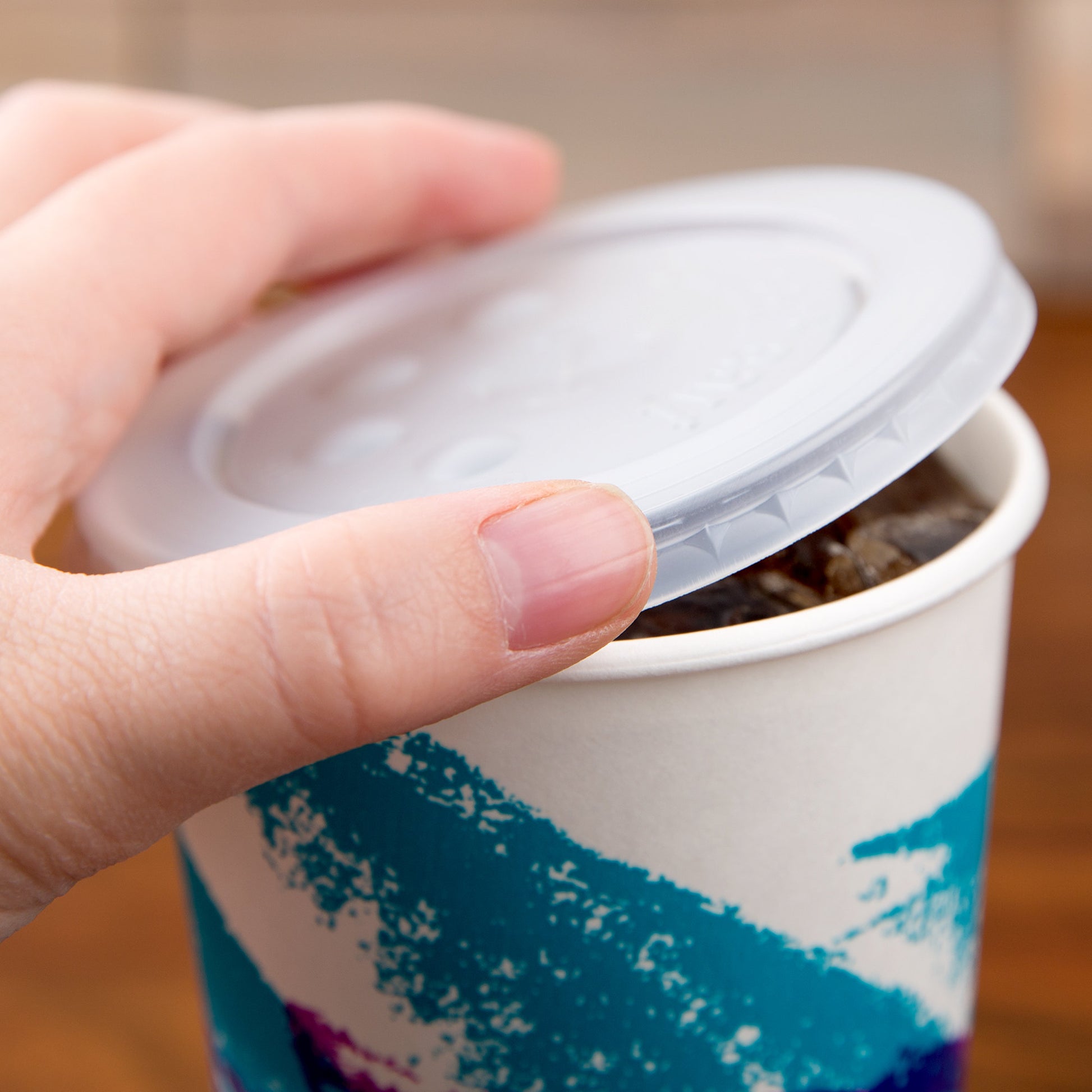 Made of high-quality polystyrene, this lid is durable and has a translucent color that allows customers to catch a glimpse of what's inside. Additionally, it boasts push-down identification buttons for fast product identification that's helpful when differentiating beverages from one another in a large order. It is even conveniently disposable and can simply be thrown out once guests have finished their beverages. Give your customers a refreshing beverage option at your cafe, concession stand, kiosk, convenience store, or fast-food restaurant with this flat, plastic lid!