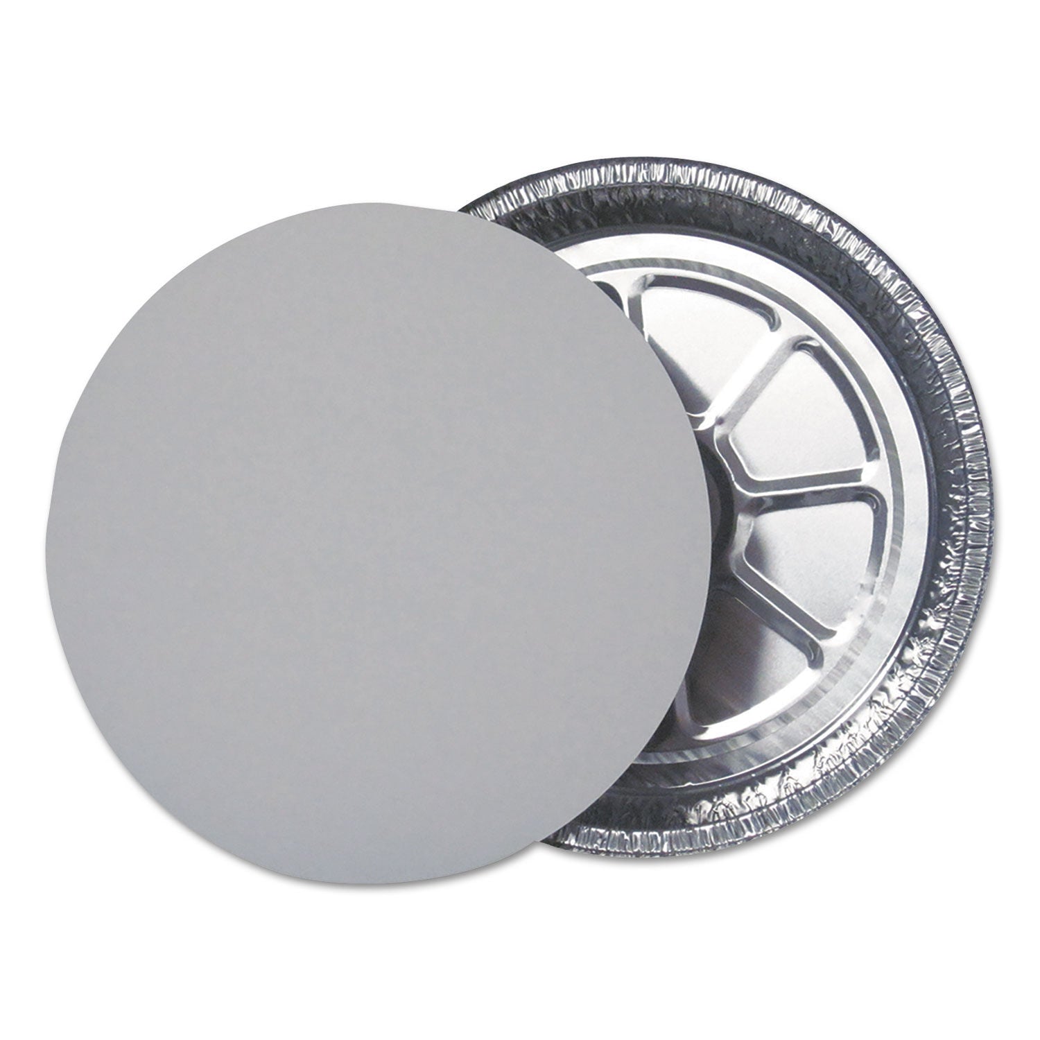 Durable offers board lids in bulk pack for round pans. Food Container Type: Carryout Lid; Material(s): Foil laminated cardboard. Color(s): Silver; Diameter: 9".
