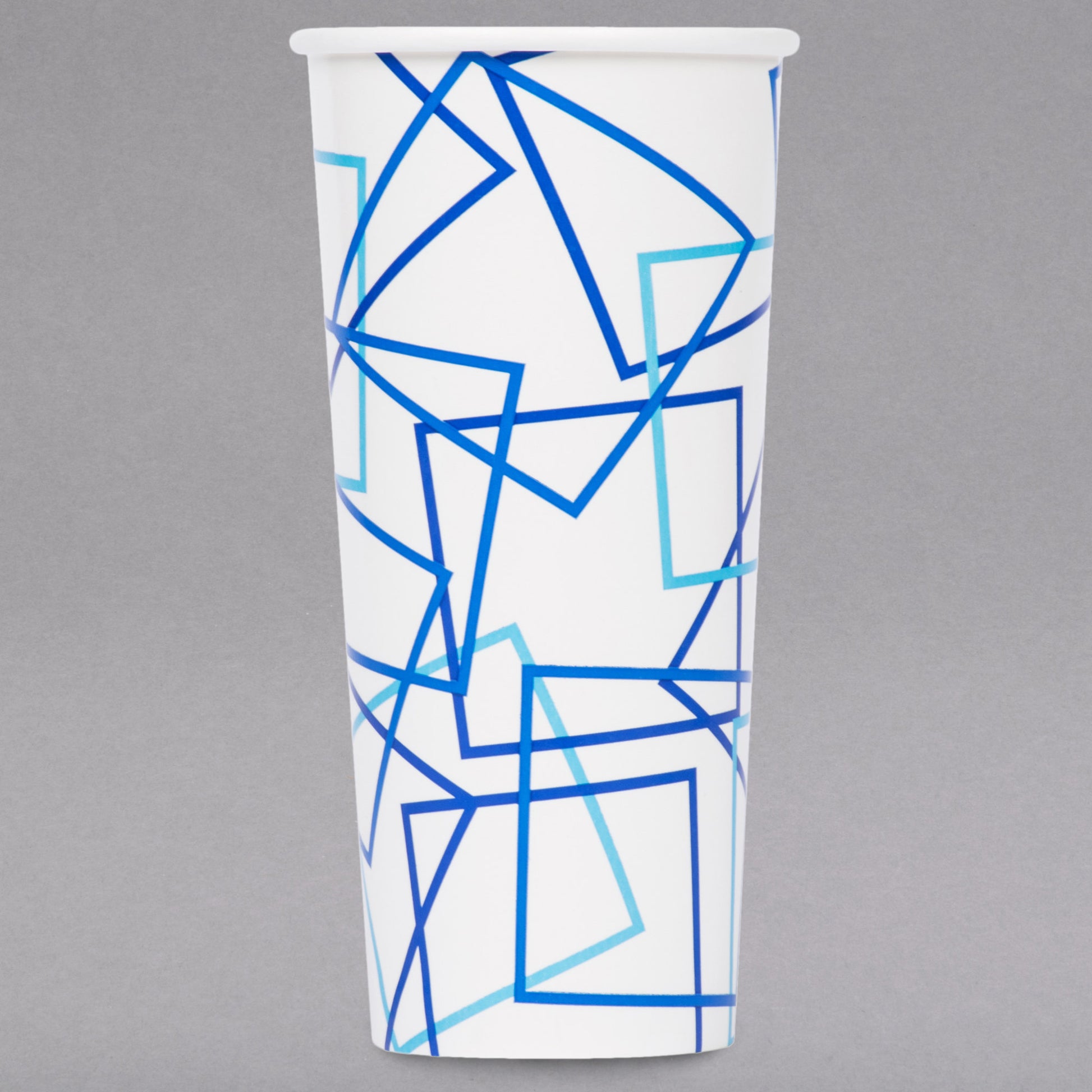 Draw customers in with the bold graphics found on this poly paper cold cup! Featuring a fun, blue cubed design in varying shades of blue against the stark white background, this cup is sure to become and eye-catching addition to your establishment.