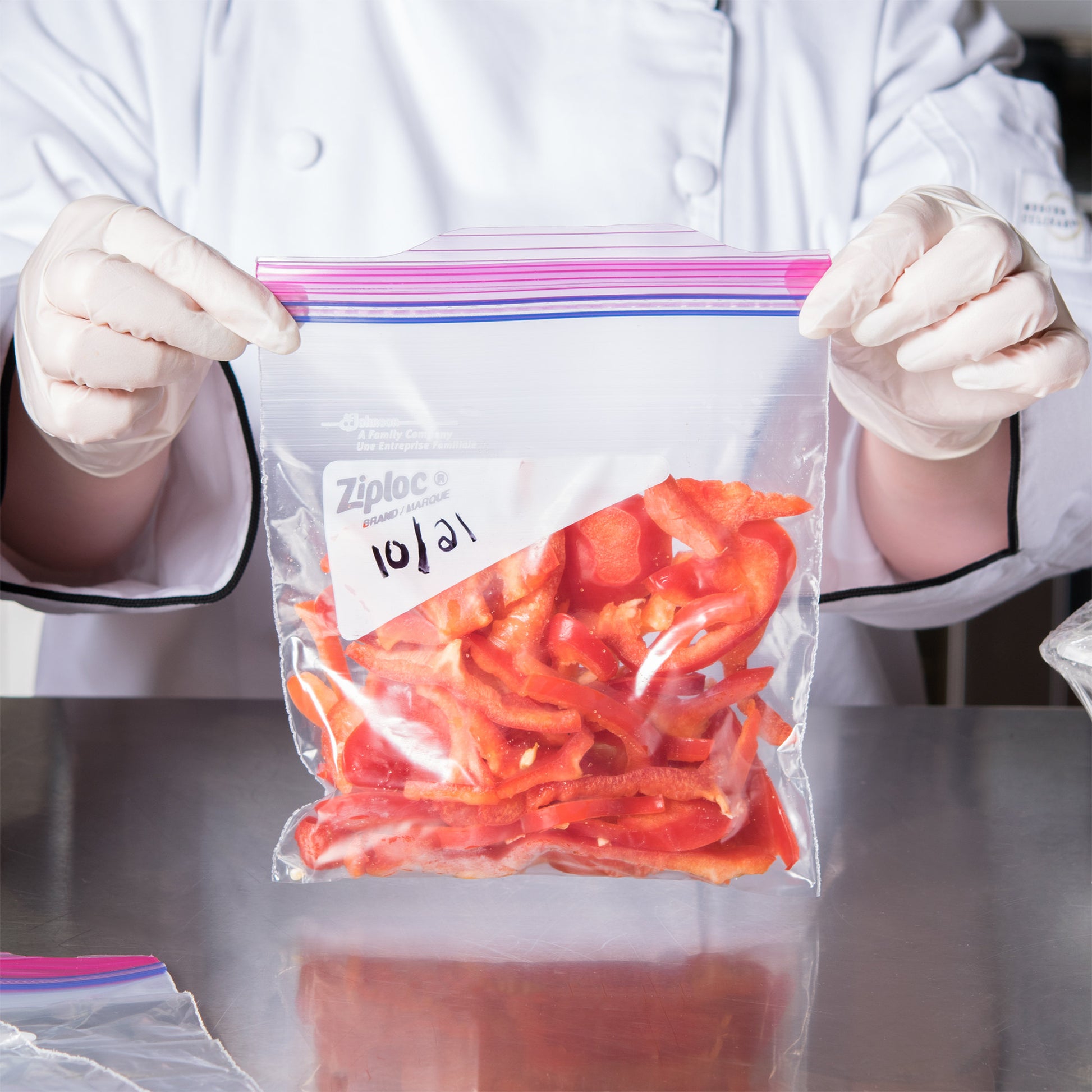 Keep food fresh and ready to use with Ziploc® 7" x 7 7/16" 1 qt. storage bags! These durable, 1.66 mil bags are a great, space-saving way to store sandwiches, vegetables, dried foods, and more. Its unique interlocking double zipper seals securely to lock in freshness, and a convenient write-on label lets you easily identify contents and use-by dates. Plus, the self-dispensing cartons and grip strip openings make these bags easy to grab and use in your busy commercial kitchen! Not recommended for storing liquids or for microwave use.