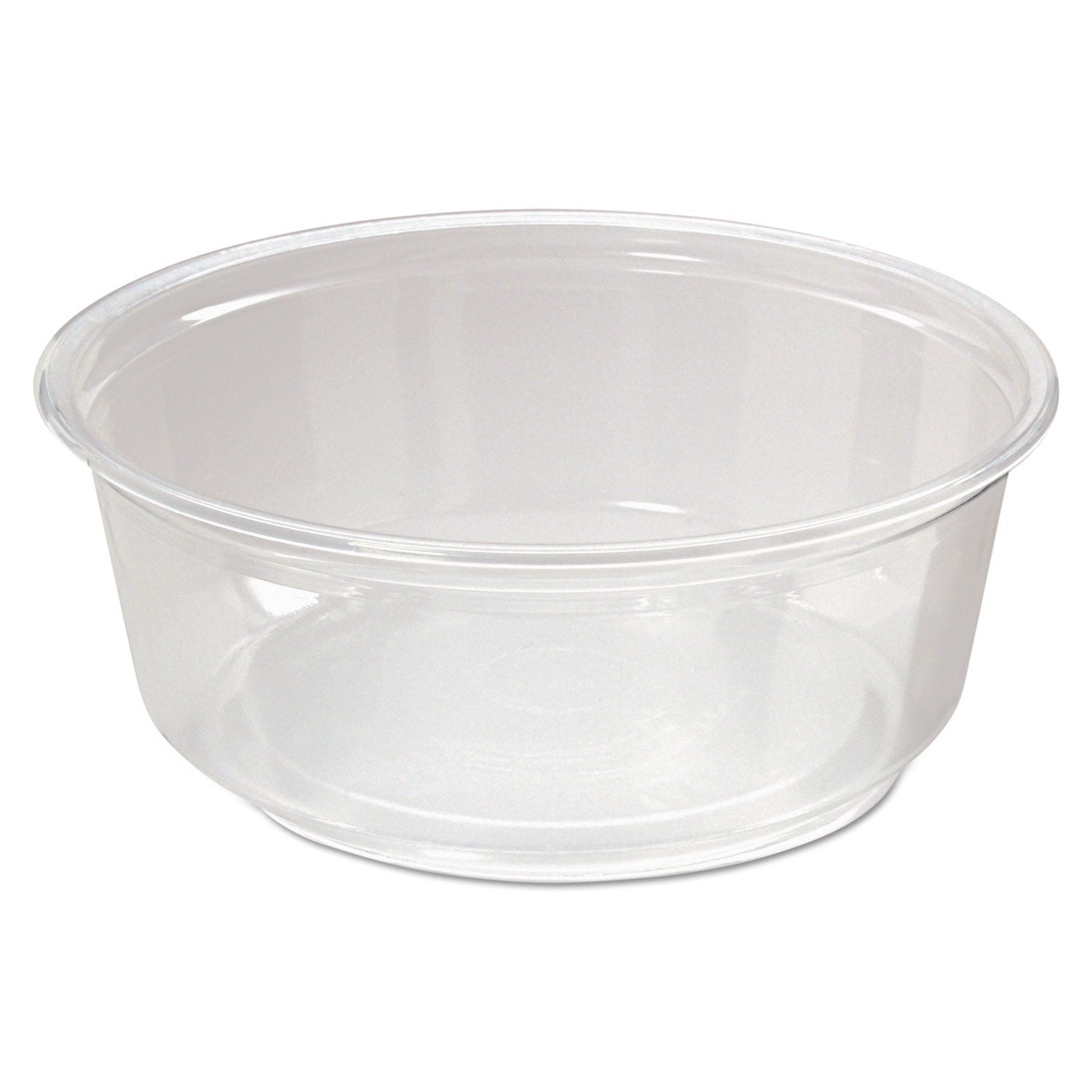 Package salads, soups and more in flavor- and odor-transfer-proof containers. Printable surface provides branding and labeling opportunities. Smooth-rolled, doubled-over rims enhance rigidity. Product line's standardized diameter delivers one-lid-fits-all convenience. Microwave-safe polyethylene withstands temperatures of up to 240°F. Food Container Type: Carryout; Material(s): Polypropylene; Capacity (Volume): 8 oz; Color(s): Clear.
