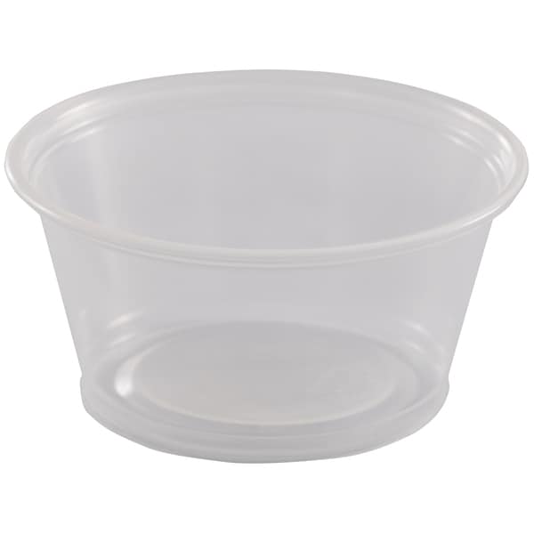 Made of durable, crack-resistant polypropylene. A sturdy choice for serving anything from salad dressing to whipped butter. For carryout, it can safely transport side sauces such as ranch dressing, marinara, salsa, and more, and its translucent PET lid construction allows customers to easily see the cup's contents.