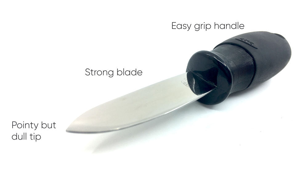 Oyster knives were first developed at the end of the 13th century. Although there are different styles, the knife used by professionals is the lancet. These oyster knives are small and hard-wearing. They have a short, rigid, lance-shaped blade and an ergonomic handle. The pointed end is useful for opening the shells as it slides smoothly between the top and bottom. Knife with stainless-steel blade and plastic handle. Traditional oyster knife with durable short blade.