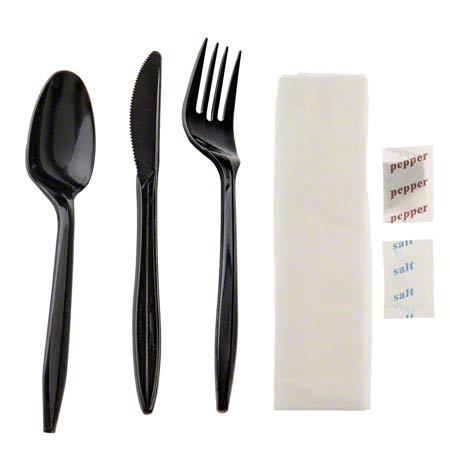 - KIT – 6/1 HVY. WT. BLACK PP FORK KNIFE TEASPOON SALT & PEPPER 12X13 1 PLY NAPKIN 250 PER CASE