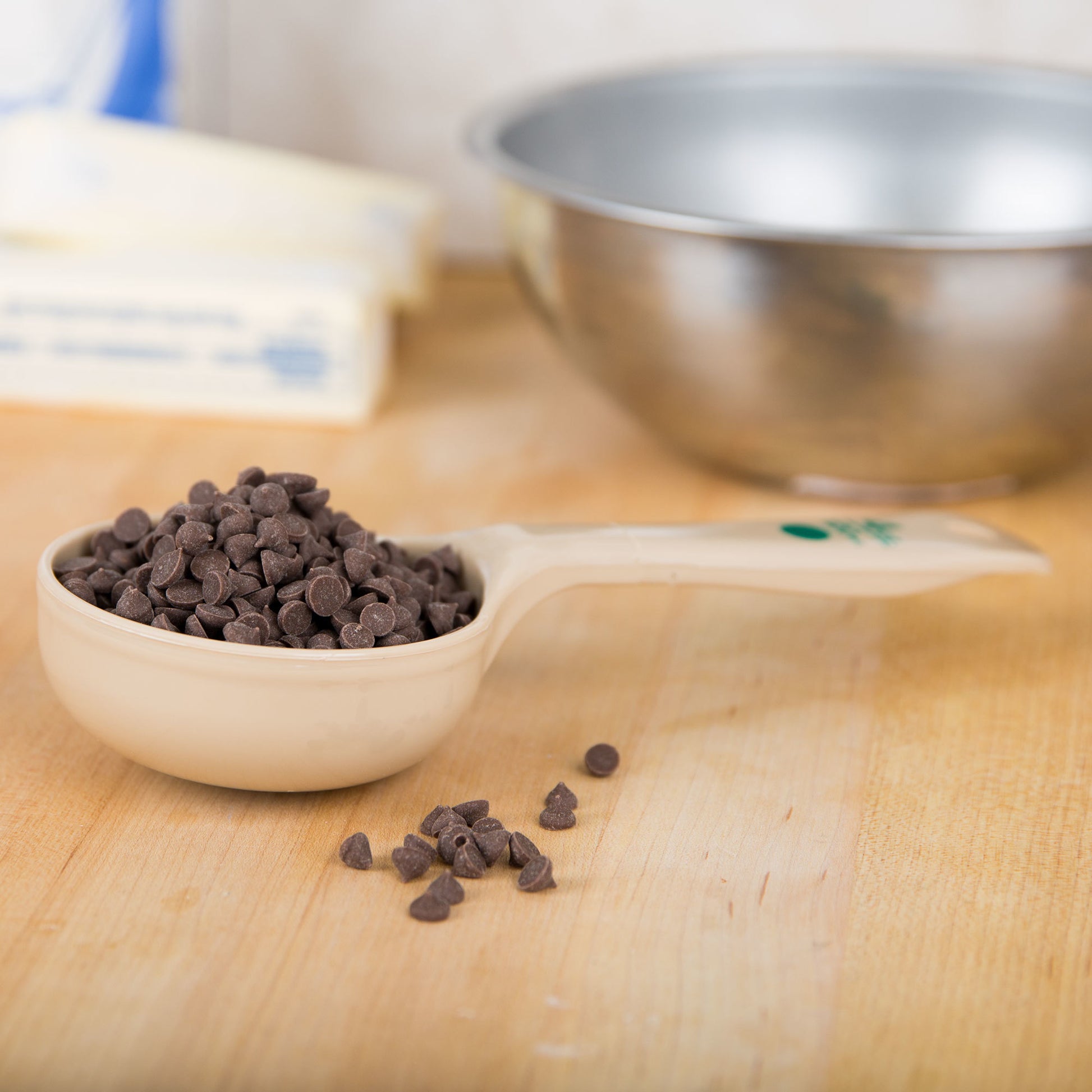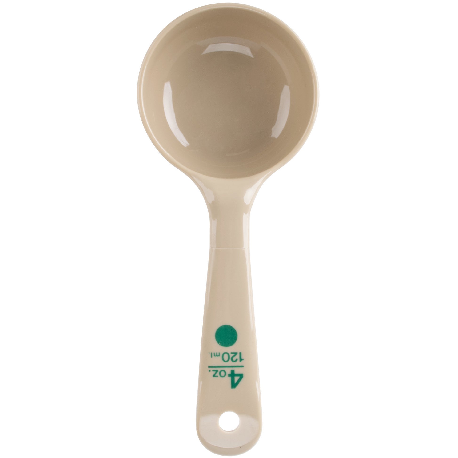 Accurately measure your foods with this Carlisle 432806 Measure Misers 4 oz. beige and green color coding polycarbonate short handle solid portion spoon! This short measuring spoon is the perfect solution for any busy kitchen or catering service. Unlike comparable metal portion spoons, this Measure Misers portion spoon is made of break-resistant polycarbonate that stays cool to the touch. It is also recommended for any temperature up to 212 degrees Fahrenheit and can withstand dry heat up to 270 degrees Fahrenheit. This spoon provides you with safe, durable, and accurate portioning that can stand up to hours of heavy use as you add the right amount of ingredients to your signature soups and prepare to satisfy your hungry customers.