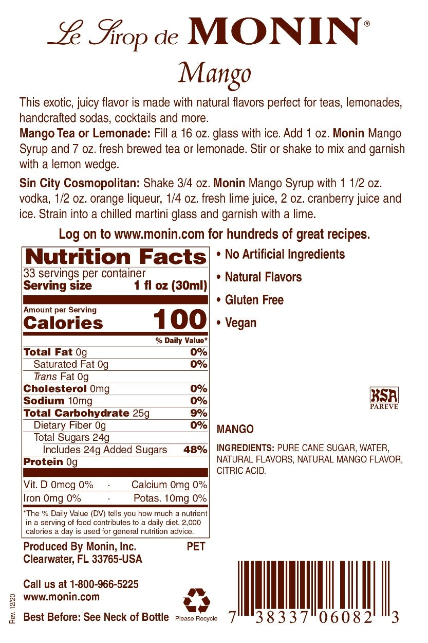 This syrup provides a quick and easy way to add exciting new flavor to a variety of your handcrafted cocktails, sodas, iced teas, and lemonades. It features a bright orange color with a sweet, juicy mango flavor and aroma that will enhance the flavor profile of your mixed or blended drinks without overpowering them or being too sweet.