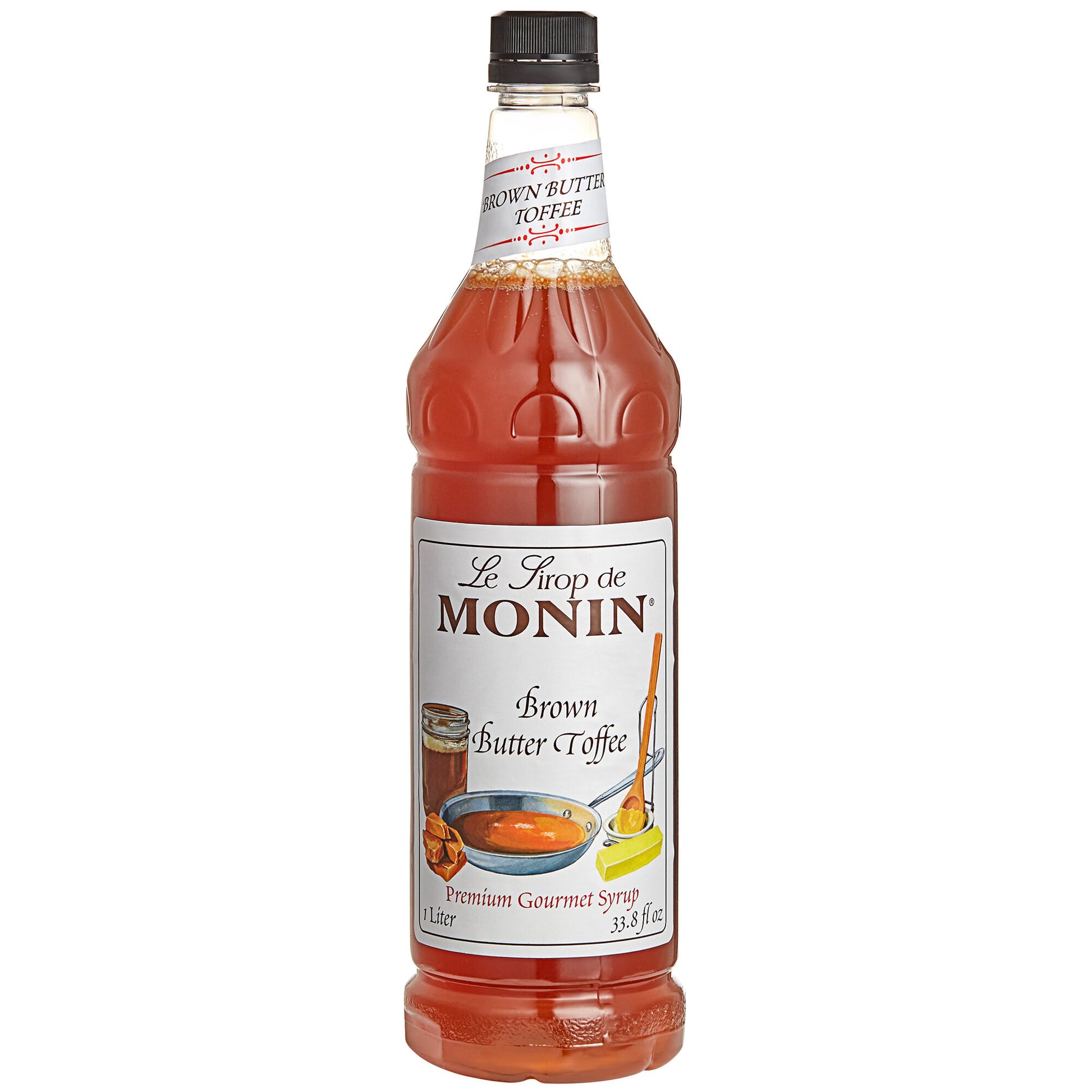 Bring distinct, indulgent flavor to your beverages with this Monin 1 liter premium brown butter toffee flavoring syrup! Combining the rich, nutty flavor of brown butter with the sweet and salty flavors of toffee, this syrup provides a quick and easy way to add exciting new flavor to a variety of your handcrafted lattes, coffees, milkshakes, and dessert cocktails. You can even use it as a topping for your gourmet cheesecakes or in a variety of baked goods and frostings! Made with pure cane sugar and no artificial ingredients, this clean label syrup will enhance the flavor profile of your mixed or blended drinks without overpowering them or being too sweet.