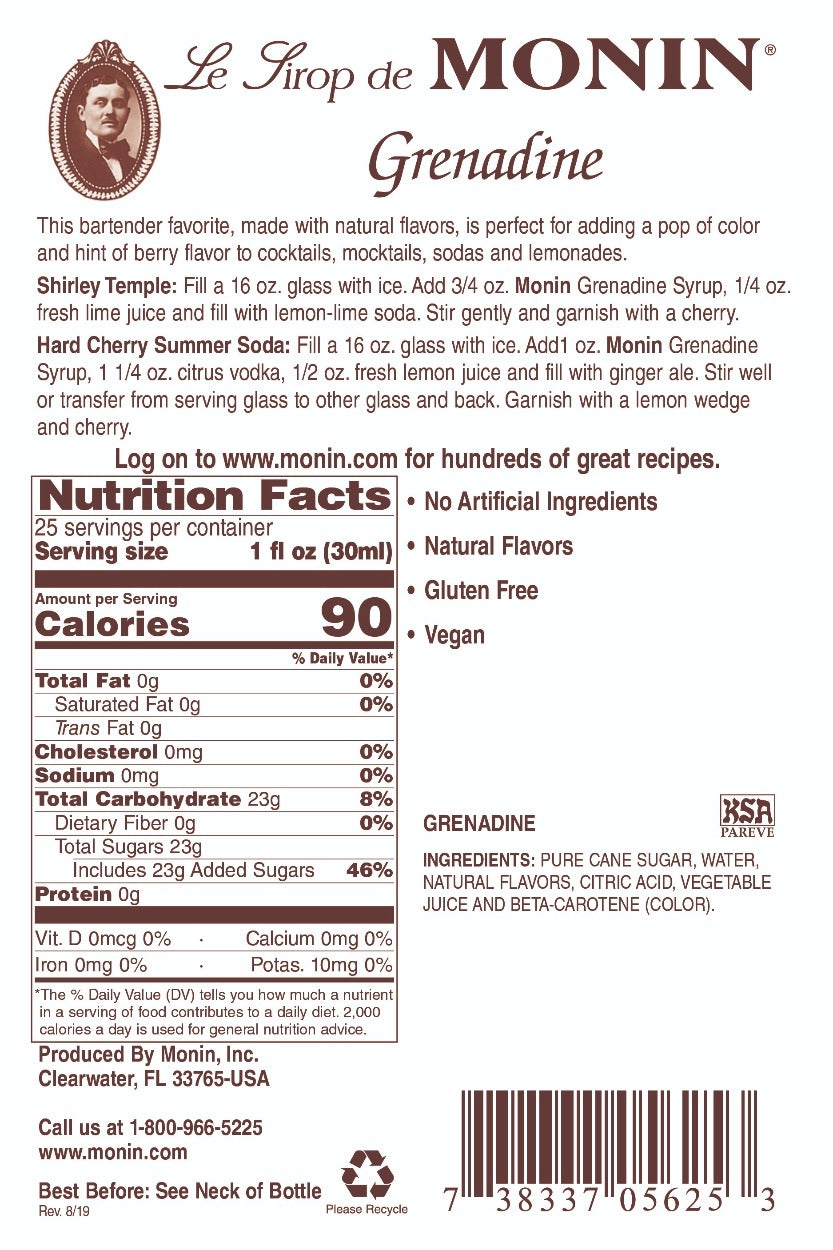 Bring fresh, fruity flavor to your beverages with this Monin 1 liter premium grenadine flavoring syrup! Featuring a bright red color and a sweet berry taste, this syrup provides a quick and easy way to enhance the flavor and presentation of your handcrafted sodas, lemonades, smoothies, and cocktails. Made with pure cane sugar, this syrup will enhance the flavor profile of your mixed or blended drinks without overpowering them or being too sweet.
