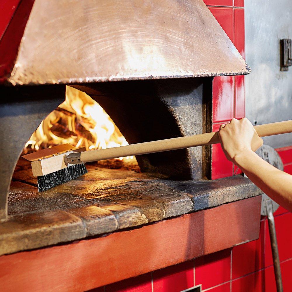 Keep your pizza oven clean and performing at its best with this 38" wood-handle, pizza oven cleaning brush! The long handle is ideal for reaching deep into your pizza oven to remove residual burnt food, heavy grease, and rust. Plus, your staff will appreciate this long brush as they clean hot ovens without getting too close to the heat. This brush also features a scraper to quickly clean oven surfaces when you need a more aggressive approach to your cleaning routine.